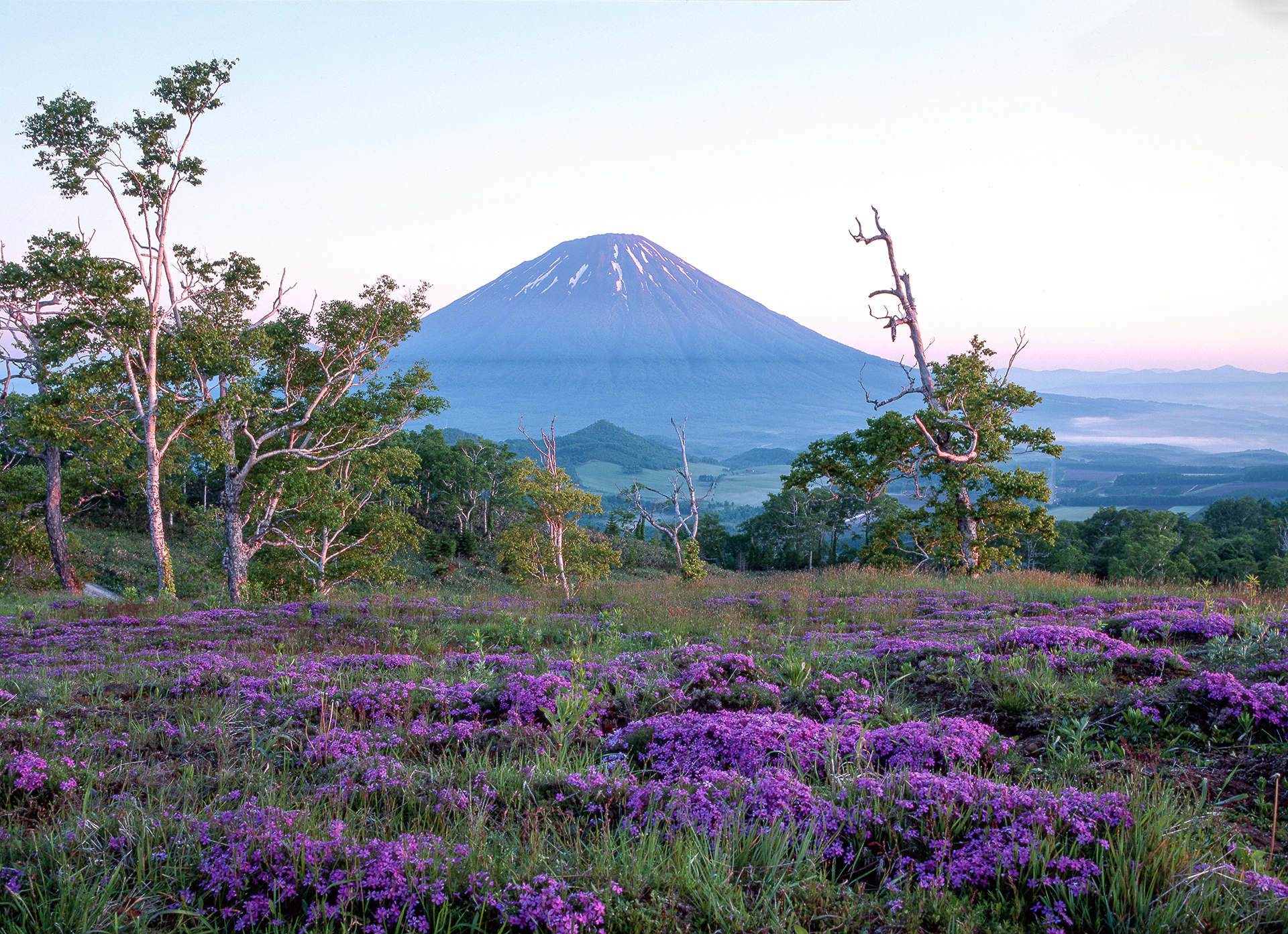 紫の花咲く高原と羊蹄山
